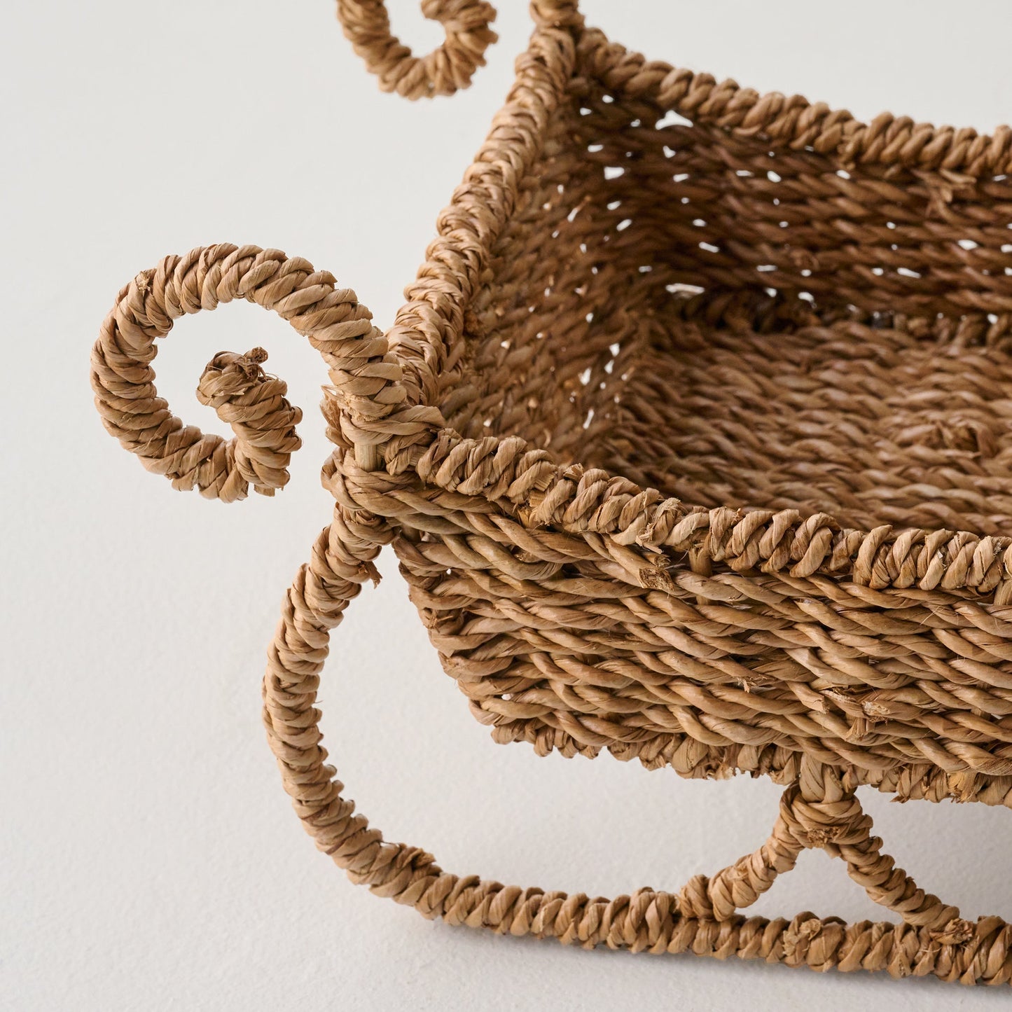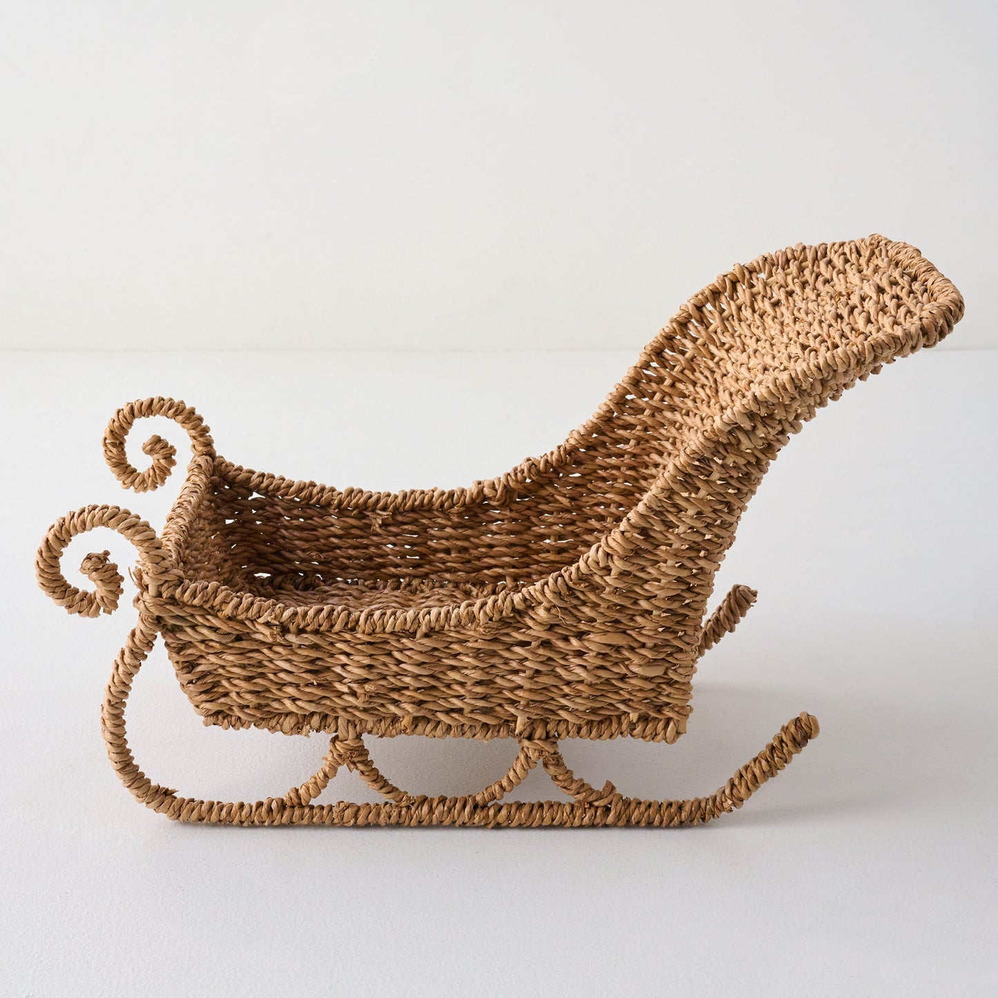 This darling sleigh is inspired by the first item Jo ever bought and sold at Jerry's Tire Shop, where she worked for her father at age 16, capturing a cherished memory in its charming design. Crafted from woven sea grass, metal, and wicker, its graceful shape, gentle curves, and refined edges infuse festive spirit and rustic charm into any holiday decor. Serving as a reminder of Jo's formative years, this sleigh will become a timeless symbol of holiday joy in your home.