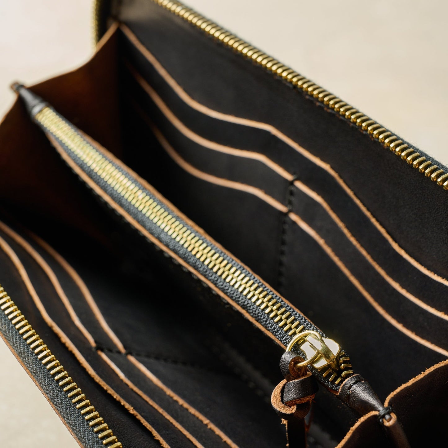Crafted from 100% full grain leather, this wallet is thoughtfully designed to be both beautiful and durable. Big enough to hold the essentials, but small enough to carry on its own, it features a zipped coin pouch, eight card slots, and two full-width cash pockets.